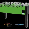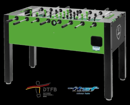 Großer massiver Tischkicker mit verchromten Stahlstangen, einzeln austauschbaren Figuren, hochgezogenen Spielfeld Ecken zur Vermeidung vom „toten“ Bällen – inkl. Ball.
